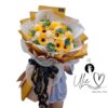 Mẫu Hoa hướng dương phối hoa sáp trắng ngà nhẹ nhàng tô điểm cho hoa hướng dương thêm phầm rực rỡ và nổi bật. Điểm thêm lá táo và hoa baby trắng cân bằng bó hoa lại hài hoà, nhẹ nhàng.