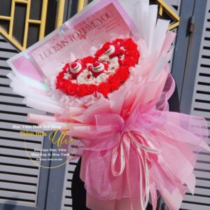 Bó Hoa Gấu trái tim hoa sáp đỏ kèm lụa