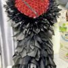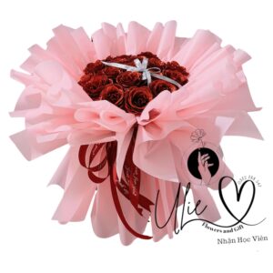 Mẫu hoa kim tuyến đỏ được kết hợp với 19 bông tạo thành điểm hoa nổi bật bên trong với lớp giấy gói hồng nhạt theo phong cách tròn đều với điểm lượn giấy giống 1 cô công chúa to xoè xinh đẹp. tô điểm thêm 1 chiếc nơ nhỏ trên hoa tại nên sự cân bằng hài hoà tô điểm cho bó hoa thêm phầm xinh động.