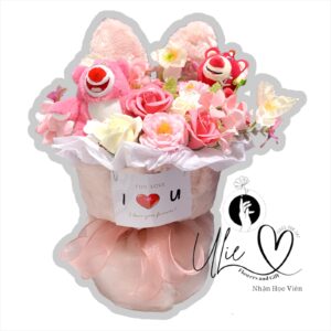 Hoa Trụ Tai Thỏ đang được giới trẻ ưu thích vì độ cute dễ thương của em nó nay Ulie thiết kế thêm hoa sáp 4 lớp phối cùng gấu mini đáng yêu tô điểm thêm sự cute cho em nó. với 2 bé Gấu cùng tone màu hoa hồng phấn nhẹ nhàng.